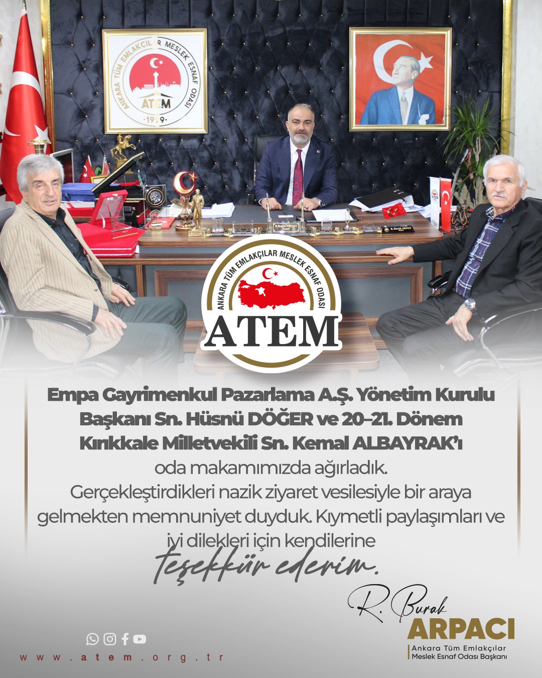 Empa Gayrimenkul Pazarlama A.Ş. Yönetim Kurulu Başkanı Sn. Hüsnü DÖĞER ve 20–21. Dönem Kırıkkale Milletvekili Sn. Kemal ALBAYRAK’ı oda makamımızda ağırladık. Gerçekleştirdikleri nazik ziyaret vesilesiyle bir araya gelmekten memnuniyet duyduk. Kıymetli paylaşımları ve iyi dilekleri için kendilerine teşekkür ederim.
