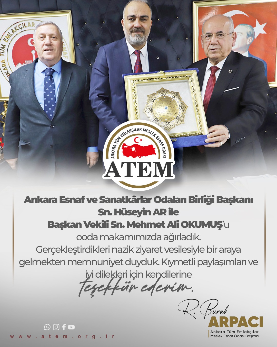 Ankara Esnaf ve Sanatkârlar Odaları Birliği Başkanı Sn. Hüseyin AR ile Başkan Vekili Sn. Mehmet Ali OKUMUŞ’u oda makamımızda ağırladık. Gerçekleştirdikleri nazik ziyaret vesilesiyle bir araya gelmekten memnuniyet duyduk. Kıymetli paylaşımları ve iyi dilekleri için kendilerine teşekkür ederim.