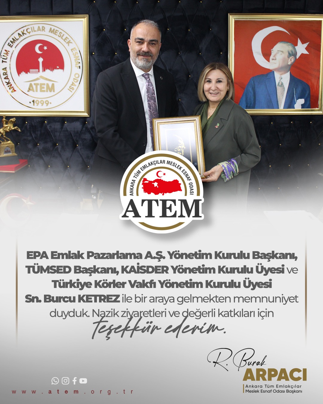 EPA Emlak Pazarlama A.Ş. Yönetim Kurulu Başkanı, TÜMSED Başkanı, KAİSDER Yönetim Kurulu Üyesi ve Türkiye Körler Vakfı Yönetim Kurulu Üyesi Sn. Burcu KETREZ ile bir araya gelmekten memnuniyet duyduk. Nazik ziyaretleri ve değerli katkıları için teşekkür ederim.
