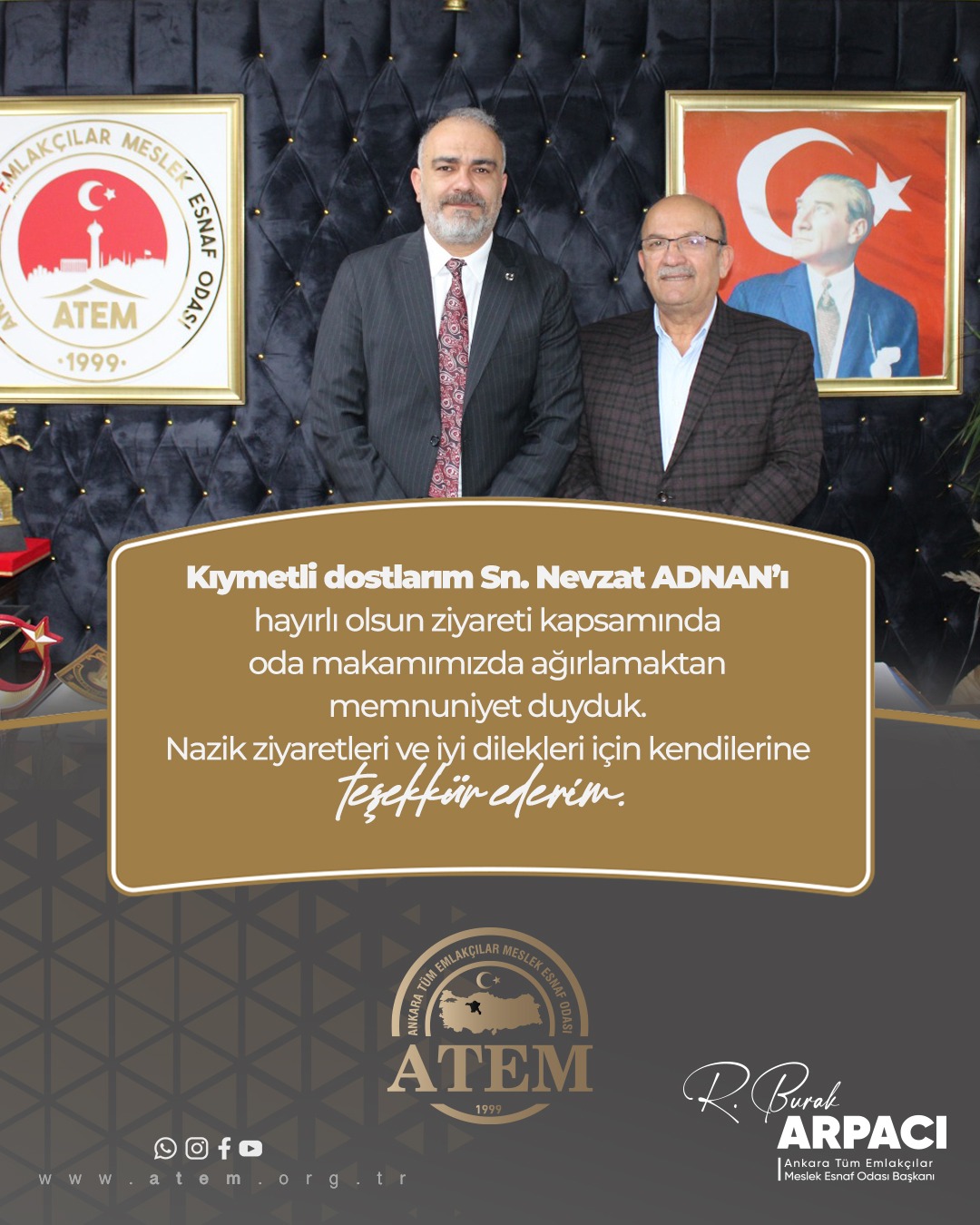 Kıymetli abim Sn. Nevzat ADNAN’ı hayırlı olsun ziyareti kapsamında oda makamımızda ağırlamaktan memnuniyet duyduk. Nazik ziyaretleri ve iyi dilekleri için kendilerine teşekkür ederim.