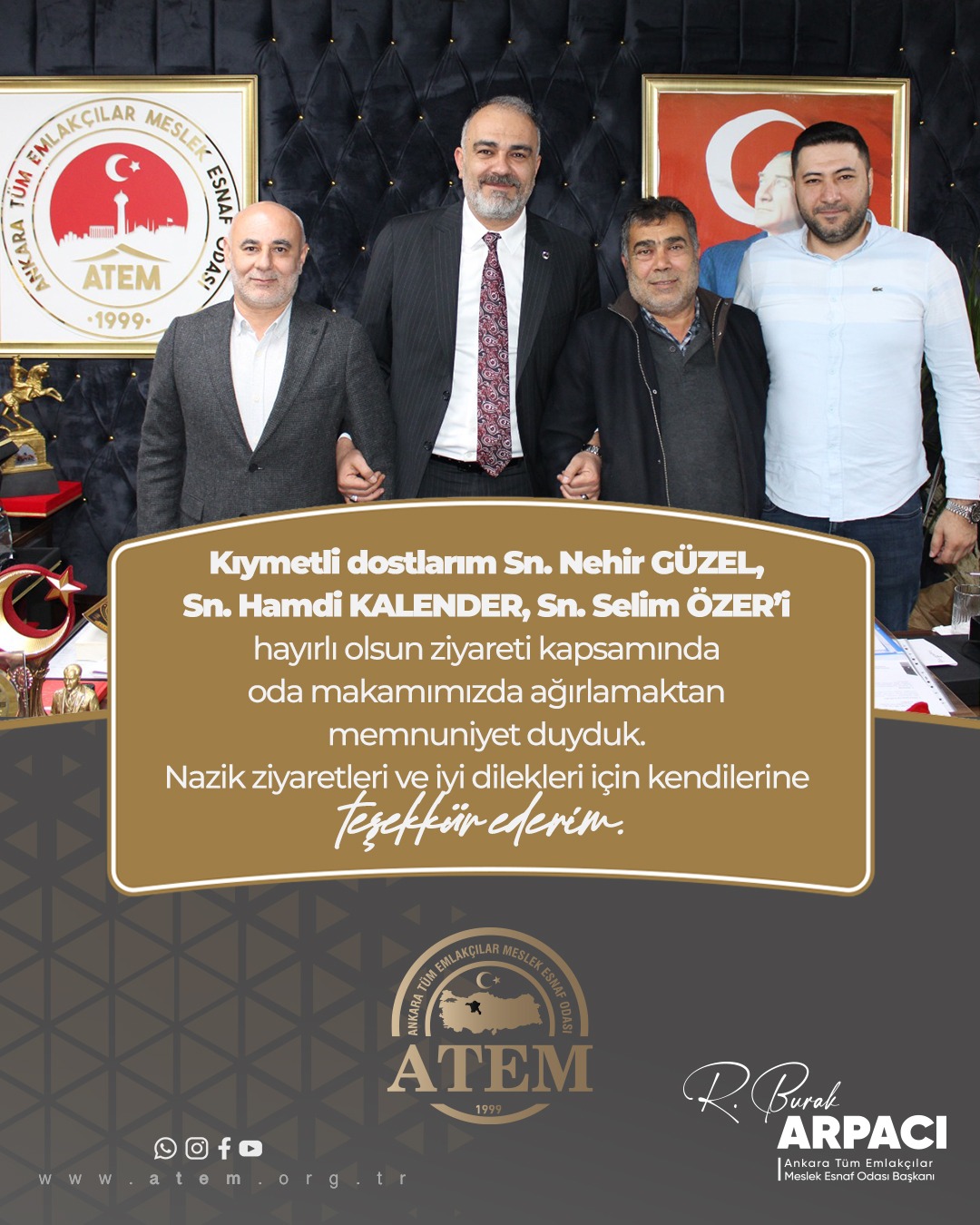 Kıymetli Dostlarım, Sn. Nehir GÜZEL, Sn. Hamdi KALENDER ve Sn. Selim ÖZER’i hayırlı olsun ziyareti kapsamında oda makamımızda ağırlamaktan memnuniyet duyduk. Nazik ziyaretleri ve iyi dilekleri için kendilerine teşekkür ederim.